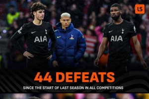 据LiveScore统计,上赛季以来热刺各赛事输掉44场比赛,与阿森纳近5个赛季(2021年8月份以来)输掉的比赛场次相同。