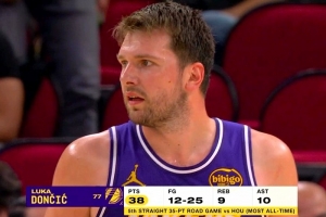 湖人客场再胜火箭,东契奇砍下40分。