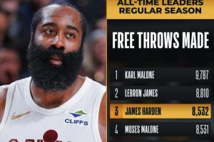 追赶詹姆斯!哈登生涯进8535个罚球 超越摩西·马龙升至历史第3