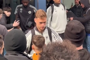基米希在德国4-3加比瑞士的比赛中被肘击受伤,今天以基米希为首的球员们仍抽出大量时间为球迷签名合影,基米希在头部裂伤后上唇贴着一块厚创可贴。