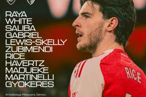 阿森纳首发:1-拉亚、4-本·怀特、2-萨利巴、6-加布里埃尔、49-斯凯利、36-苏维门迪、41-赖斯、29-哈弗茨、20-马杜埃凯、11-马丁内利、14-约克雷斯