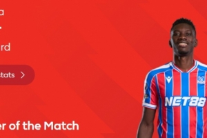 梅开二度,英超官方:萨尔当选水晶宫3-1热刺全场最佳球员